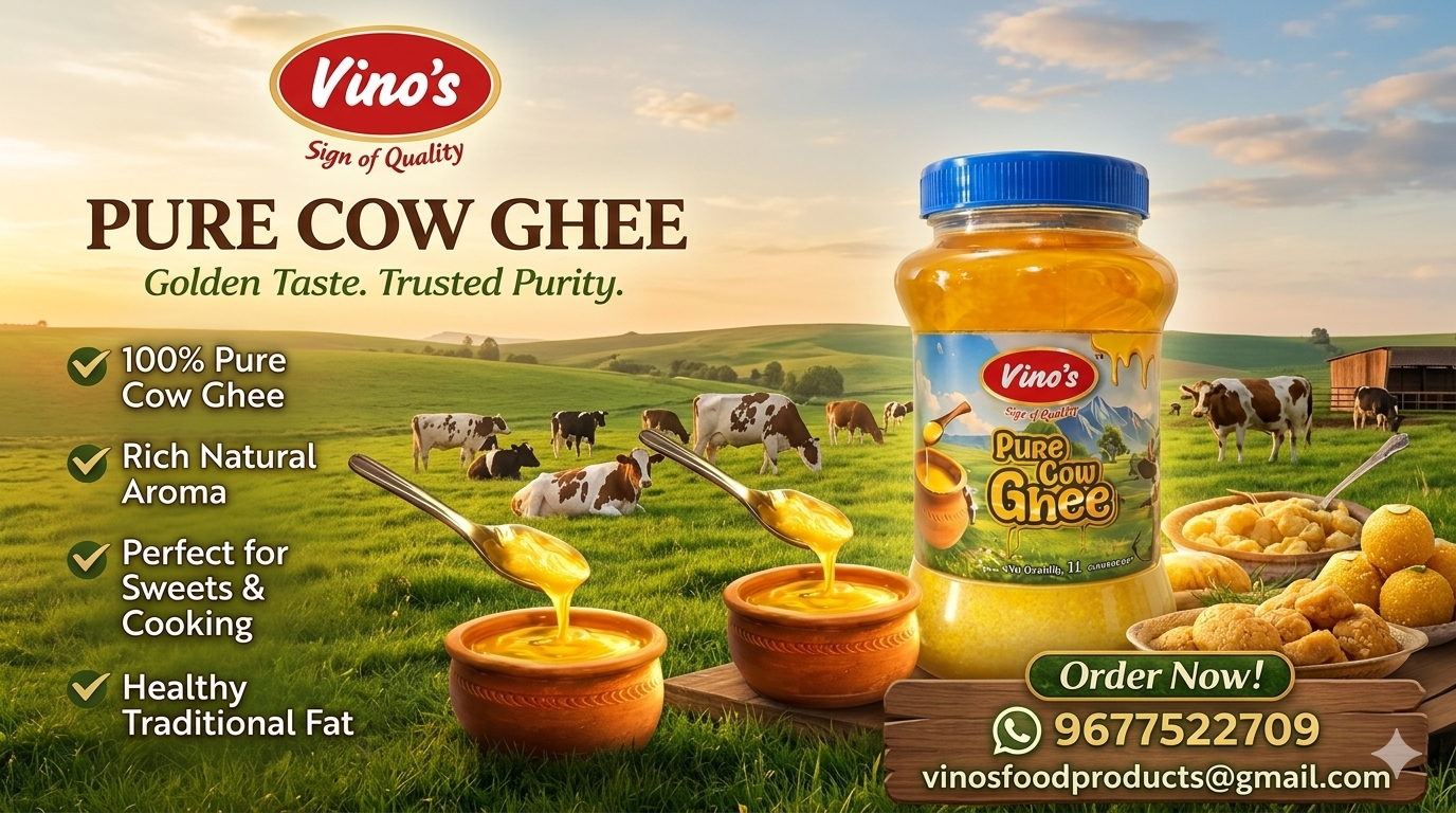 VINO'S FOOD PRODUCTS is an entrepreneurial organization that manufactures Cow Ghee & Buffalo Ghee with a touch of traditional taste. Its Superior Granular Texture, Aroma and Purity enabling it to offer all individuals with High-Quality Ghee that makes food Healthy and Delicious.